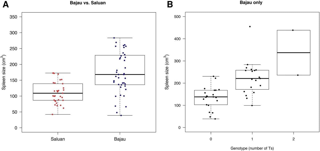 To change this, the researchers behind today’s paper used genetic association studies to find a few candidates and they correlated one of them, PDE10A, to increased spleen size in the Bajau population (See the figure above).