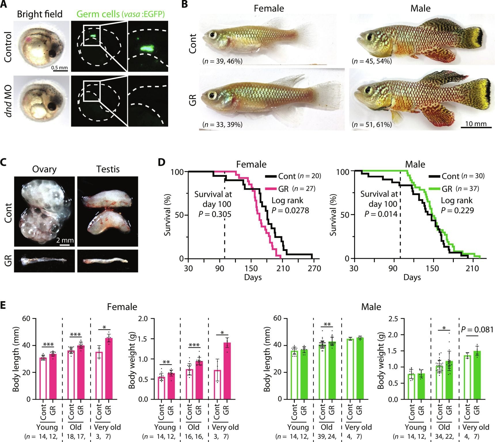 Abe K, et al. 2024. Sex-dependent regulation of vertebrate somatic growth and aging by germ cells. Science Advances. DOI: 10.1126/sciadv.adi162