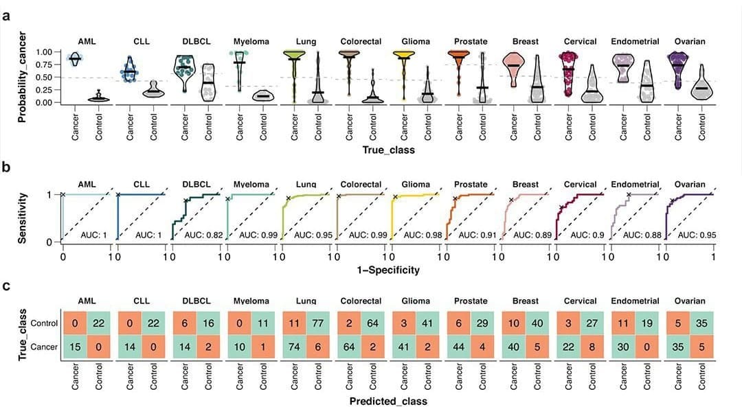 They then took the data from those results and used machine learning to develop algorithms for predicting AML, ALL, DLCBL, Myeloma, Lung, Colorectal, Glioma, Prostate, Breast, Cervical, Endometrial, and Ovarian cancer.